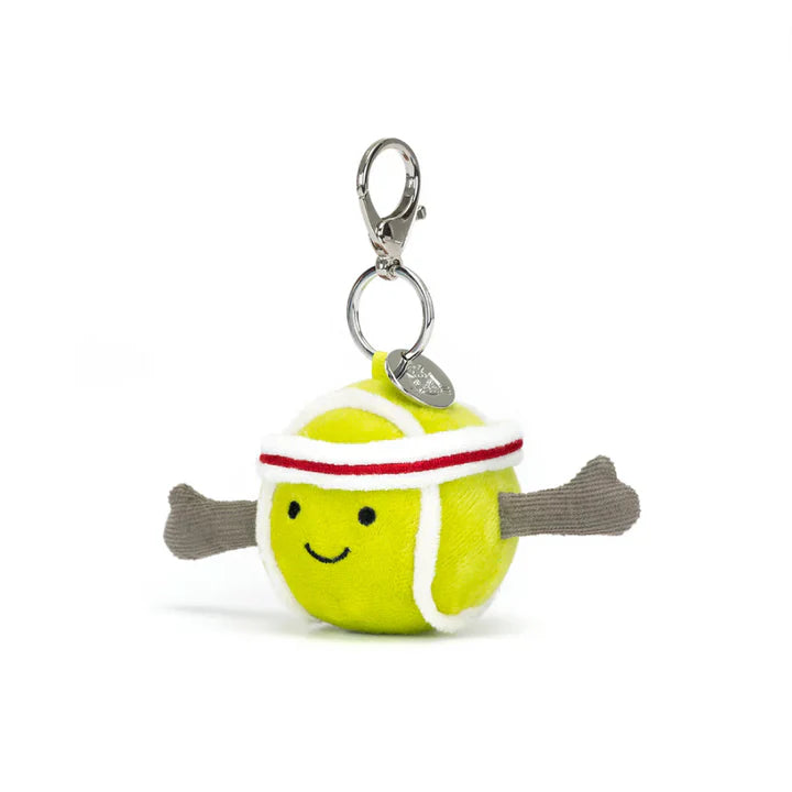 Serve up some playfulness with the Amuseables Sports Tennis Bag Charm by Jellycat. This plush tennis ball charm comes equipped with a sweatband, making it the perfect accessory for any tennis enthusiast. A must-have for adding a fun touch to your bag!