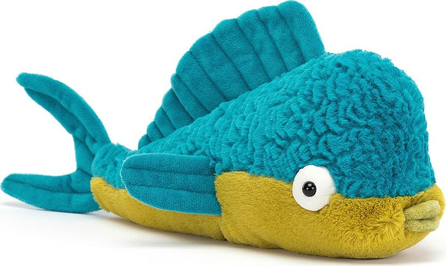 Loud, proud and utterly adorable, it's Delano Dorado Fish! Rocking an aqua dorsal fin, stitchy flippers and a punky crescent tail, this fabulous fish has a zesty lime tummy and suedey bubble lips. Tufty-textured with big bobble eyes, Delano's a kooky cutie.
