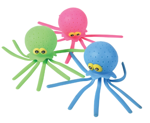 Colorful, stretchy octopus with absorbent material inside. Immerse these creatures in water and throw them for a splashing good time! Sold Individually.